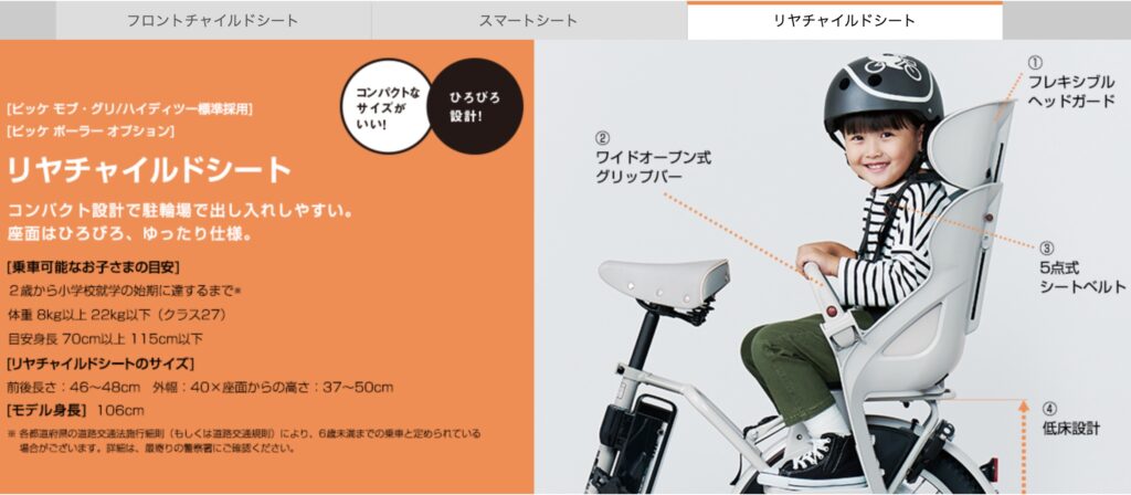 チャイルドシートには、ブリヂストンのようにグリップバーが付き左右どちらからでも乗り降りできる仕様になっています。