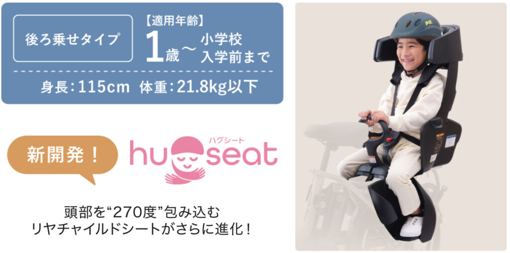 - 後乗せチャイルドシートは、頭部を270度包み込み、足も巻き込み、すれ違い接触から守る仕様
